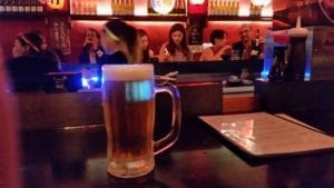 Der Kartenverkäufer gab mir den Tipp, doch vorher noch im Tankuki’s Cave nebenan etwas zu essen, um eine solide Grundlage für den Abend zu haben. Gesagt, getan. Und für die undefinierbaren, japanischen Tapas (ich glaube, es waren Hühnerherzen) braucht man durchaus Humor oder doch zumindest ein Pint Okinawa-Bier zum Herunterspülen.