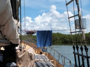 Nun ist es eher weniger erfolgversprechend, in fremden Ländern schnurstracks in Häfen zu wandern und in Sprachen, die man nicht spricht, nach alten Seglern zu fragen. Daher habe ich vorher ein wenig Recherche betreiben müssen. In Kambodscha war kein Segler aufzutun, aber in Indonesien und hier glücklicherweise auch noch auf Bali, bin auf die Adelaar gestoßen. Eine kurze Anfrage gestellt, Laura gibt grünes Licht und ich darf an Bord gehen!