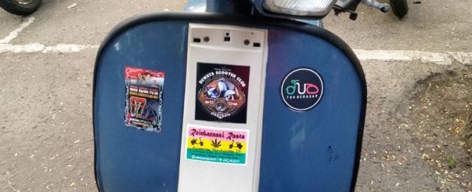 Es wird schon wieder italienisch. Nachdem erst kürzlich der Rigoletto abgehandelt wurde, muss nun das ureigenste italienische Produkt auf zwei Rädern dran glauben. Auf Bali, und insbesondere in Ubud, stehen sie an allen Ecken und Enden und verweisen mit ihrem zeitlos kurvigen Design alle japanischen Plastikchassismodelle auf ihre Plätze: Vespas. Von 1972 bis 2001 übrigens als Lizenzprodukt eines indonesisch-dänischen Joint Ventures auf Java gebaut – und in den seltensten Fällen aus Italien importiert. Natürlich wurde die Travelling Lady sehr, sehr neugierig, als sie die Aufkleber auf einigen alten Vespas sah. Und auch der stilsichere Denpasaraner hatte einen geheimnisvollen Sticker an seinem Gefährt. Das wollte sie doch genauer wissen…