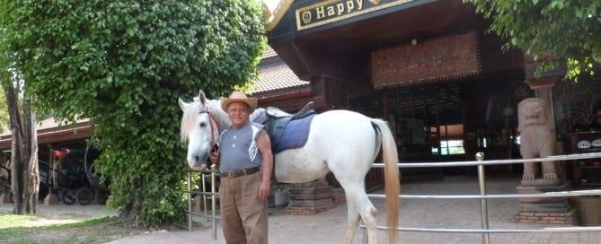 Dabei wäre es für Sary Pann, Eigentümer der „Happy Horse Farm„, nur einer der vielen Umzüge und Umbrüche in seinem Leben. 1941 in Siem Reap geboren und dort aufgewachsen, erlebte er die Wirren um die Landnahme zwischen Thailand und Kambodscha unter der Duldung der französischen Kolonialherren ebenso wie den Vietnam- und Bürgerkrieg. Der Beginn des Vietnamkriegs war für ihn die Möglichkeit, aus der Provinz auszubrechen: „Ich wollte etwas lernen, sehen und in die Großstadt!“ 1969 ging er nach Phnom Penh, um sechs Jahre lang für die amerikanische Botschaft zu arbeiten. 1975, kurz bevor die Roten Khmer die Stadt eroberten und die Bevölkerung entweder vertrieben oder umbrachten, holten ihn seine Dienstherren außer Gefahr. Sary Pann wurde erst nach Thailand gebracht, dann nach Kalifornien.
